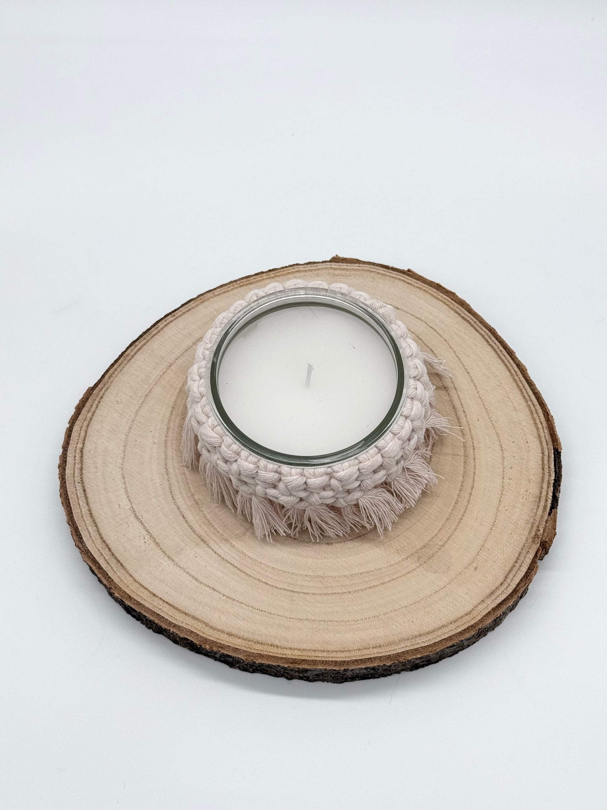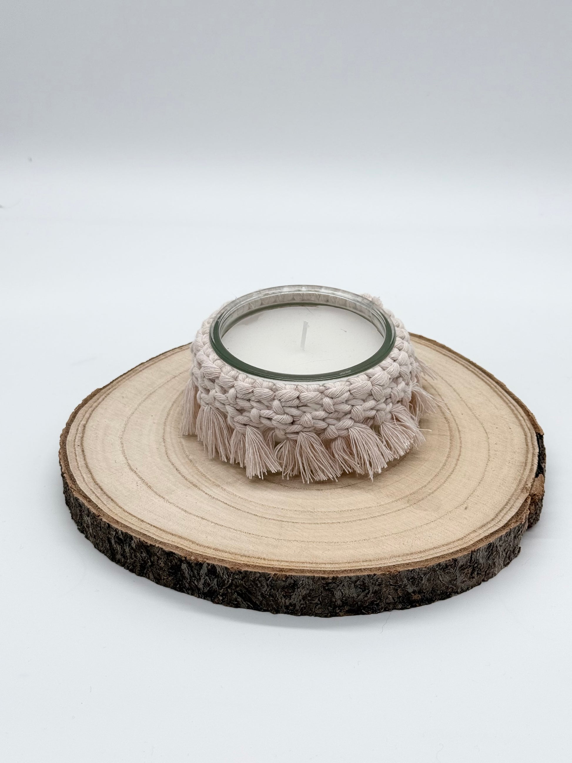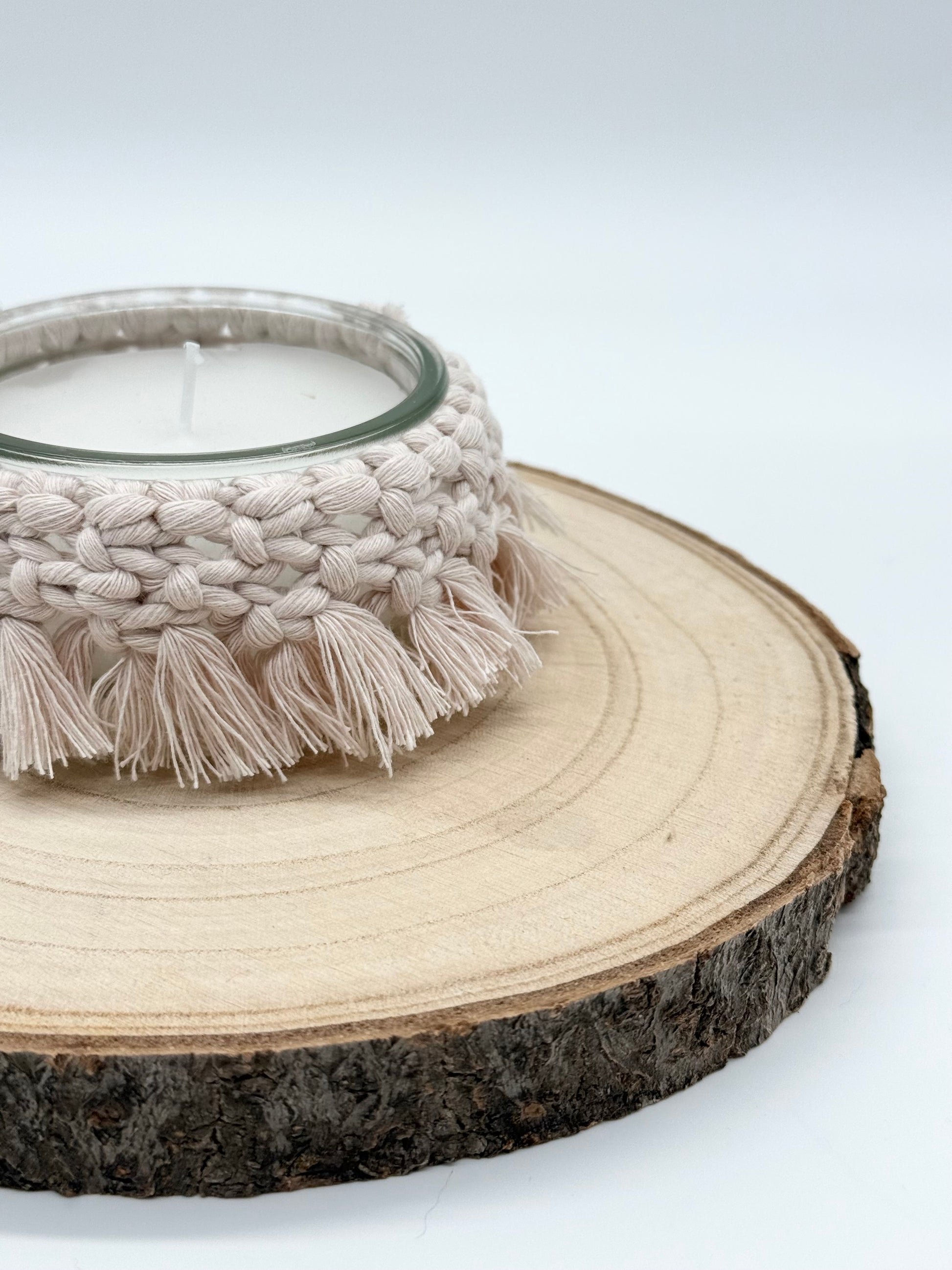Faites entièrement à la main, cette jolie bougie est entourée d'un tissage en macramé.